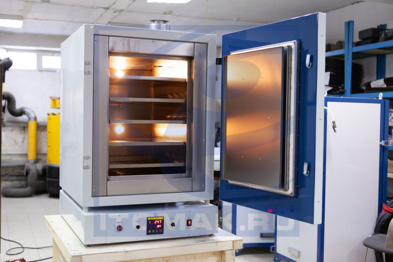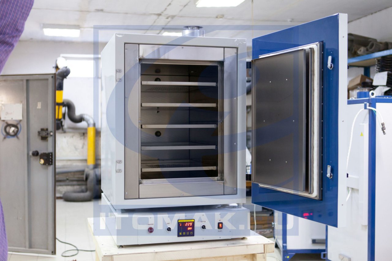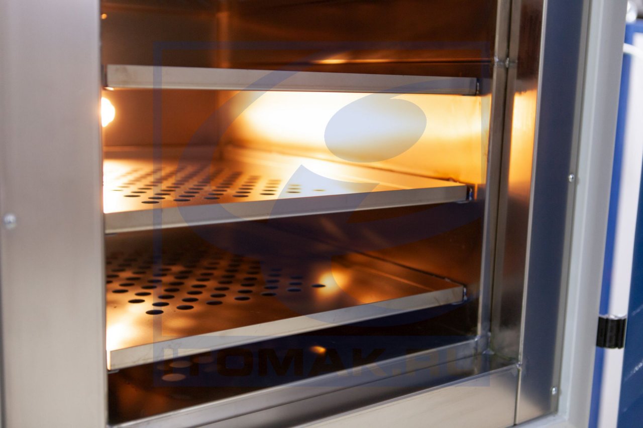 Внутри шкафа расположена рабочая камера выполненная из титана. Камера укрыта слоем теплоизоляции. С боков, на внутренней поверхности камеры закреплены направляющие уголки для установки перфорированных полок.